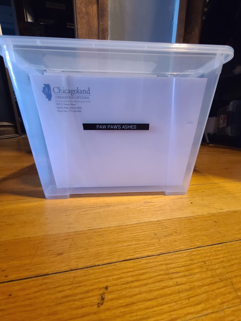 They don’t explain to you what you are supposed to do when you’ve got no money and your dad dies. Thank god for Catholic Charities but they don’t explain what you do when you don’t have the money for an Urn or to bury your dad because remember, you couldn’t even prevent him from going to the county morgue (don’t think about that, don’t think about that, you made it right in the end. you made it right, mostly, in the end). But you go to pick up your father’s remains, find out that he didn’t even fit into one remains box, so you get a reusable tote with the crematorium’s name on it (yeah, I’ll take that to go buy my groceries in it… If it wasn’t the bag for my dad, my morbid sense of humour WOULD do just that, but I can’t… because this bag held my dad, and it’s okay if its your dad, but it’s not okay if it’s my dad… see how that works?). So you bring your dad home and you just stare at the two boxes wondering what to do, then realize well, you’ll just but him in an Ikea storage bin in your closet until you get evicted or you become a millionare and can deal with it. And it’s surreal as fuck. And you feel just.. weird…